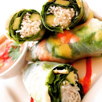 Julienne carrots, asparagus, avocados, and cucumbers. Served with creamy peanut sauce